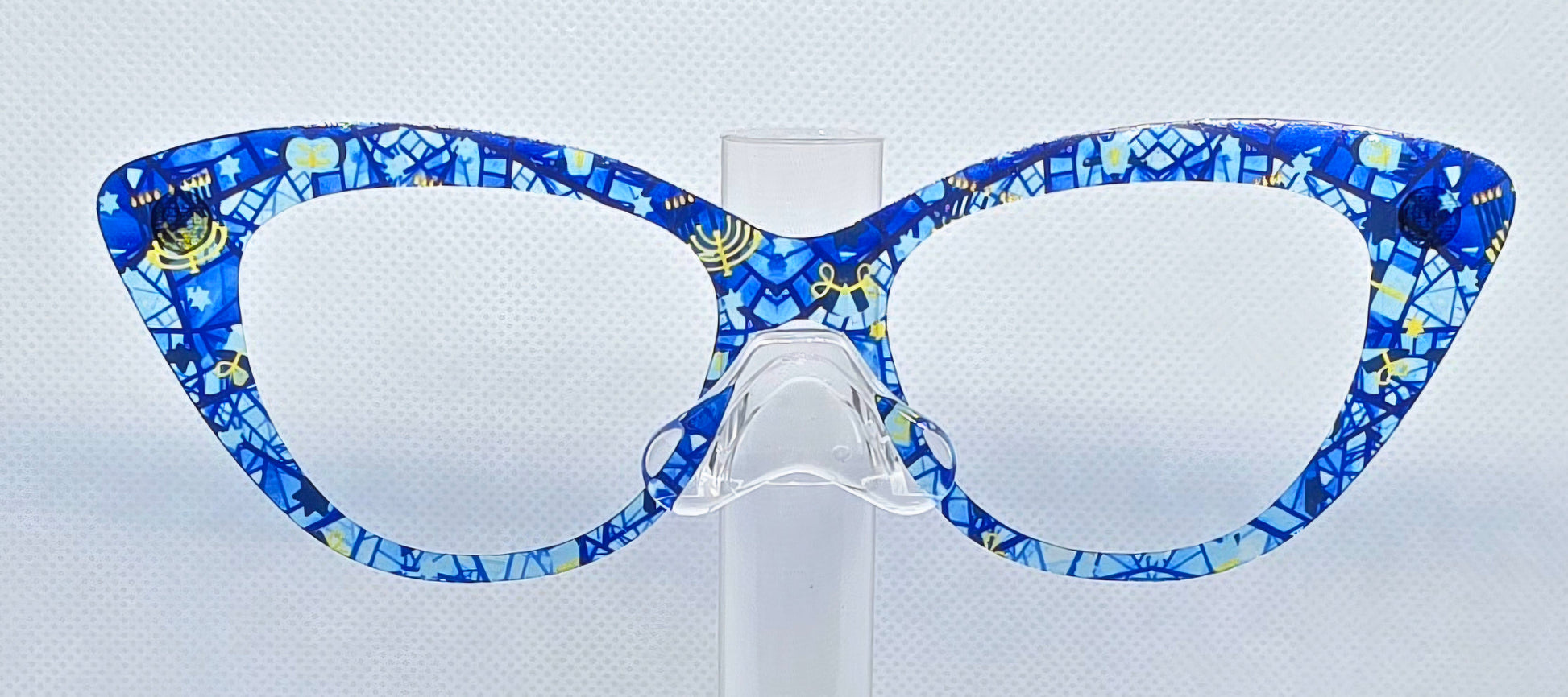 **Topper Bases: Designs are printed on a white base by default. If a translucent base is chosen, please keep in mind that the design will be more subtle and transparent. The white base will have a more vivid and crisp look. The clear option is not recommended for dark frames. White & light colored designs will show clear or light colored with the translucent option.